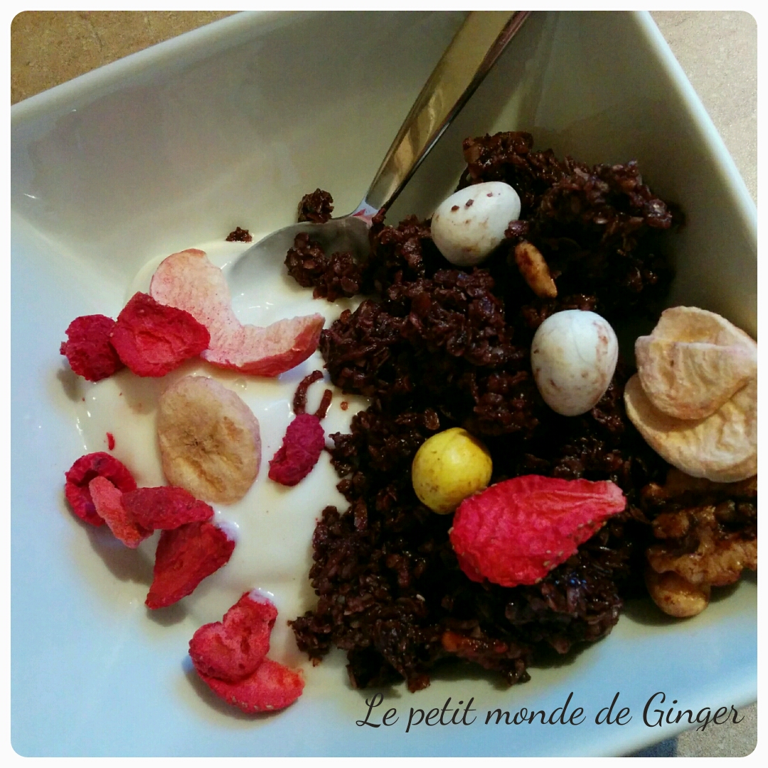 Et ce qui est cool avec les Eggies, c’est qu’on peut faire pleins de recettes. Cette semaine, j’ai fait des granolas au chocolat de Trois fois par jour, et plutôt que d’y mettre des pépites de chocolat, j’y ai ajouté une pleine poignée de mes œufs préférés…Ainsi que quelques morceaux de fruits lyophilisés de Mixit question d’équilibrer le tout. La photo ne leur rend pas justice, mes granolas au chocolat ne sont jamais très photogéniques, mais je vous les montre pareil :