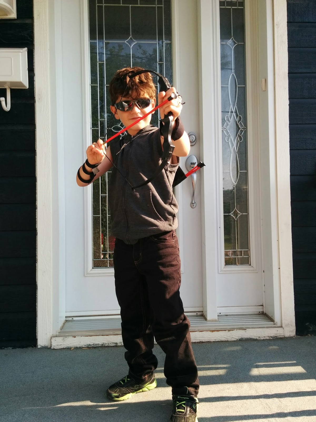 La première chose que j’ai fait par moi-même pour agrémenter le costume fut le bracelet servant à tenir les canifs de Hawkeye. Pour cause de bras de petits garçcon, il y en que 3 plutôt que 4 comme sur l’original. L’ayant cousue à la main, ça m’a demandé plus de temps que prévue, mais il est cousue solidement et mon fils peut continuer de le porter à sa guise. J’ai ensuite fait le bracelet servant à manier l’arc. Je ne me suis pas cassé la tête, j’ai utilisé un bracelet à moi que j’ai recouvert de tissu noir et auquel j’ai ajouté 3 rubans et des élastiques au bout, car je n’ai pas trouvé de bagues. Finalement, pour le carquois, j’ai utilisé 2 rouleaux de papers essuis-tout que j’ai collé avec du duck tappe. Un rouleau est fermé dans le bas pour y mettre les flèches et l’autre ne l’est pas de façon à y passer la corde. L’arc et les flèches viennent du dollo tout simplement. Ajouter à ça une paire de lunette fumé et le tour est joué 🙂