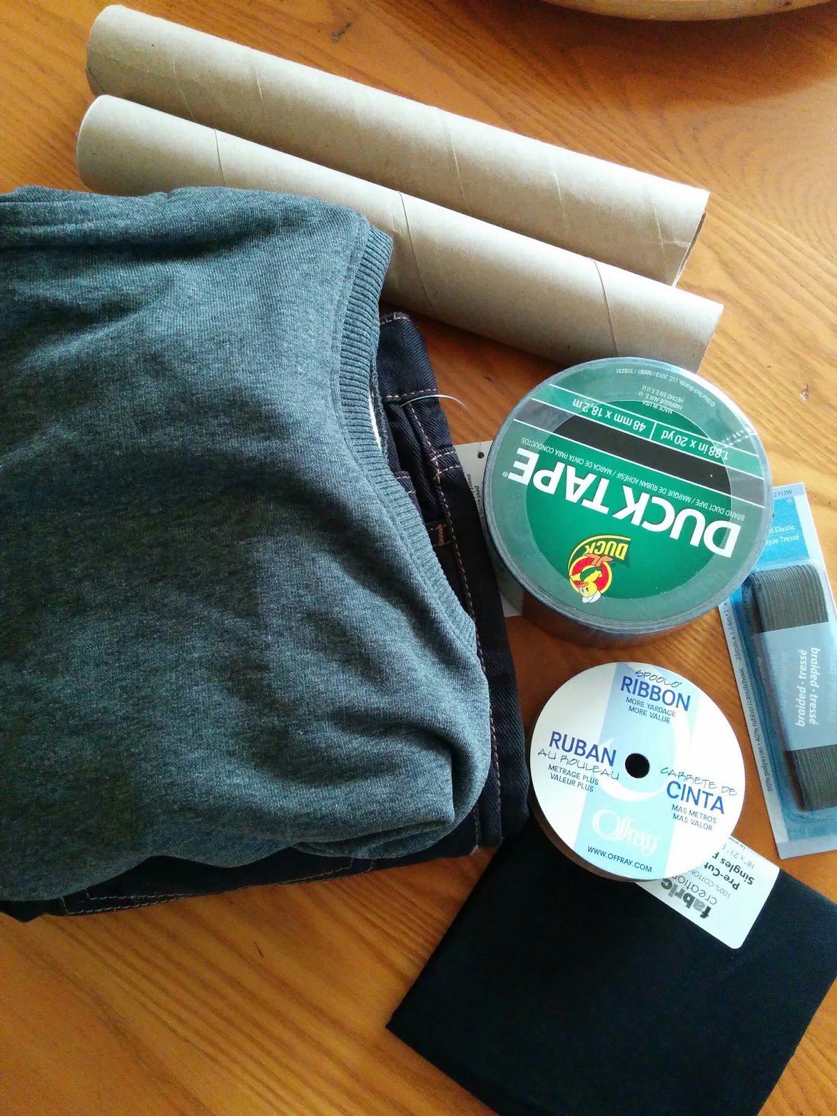 Comme je ne couds pas vraiment (il n’y a rien à faire, j’oublie toujours comment enfiler l’aiguille de la machine, si bien que je l’ai donné, car elle ne servait jamais), alors j’ai opté pour l’option d’acheter un pantalon et une camisole noir. Des jeans noir à 7$ et, à défaut d’avoir trouvé une camisole noire (elles avaient toutes des dessins), mon conjoint a mis la main sur une veste à manches courte avec fermeture éclair, ce qui est encore mieux. Si on adittionne le coût du matériel, ça m’a coûté plus ou moins 30$, mais les vêtements vont resservir souvent , contrairement au costume que j’aurais pu acheter à la place.
