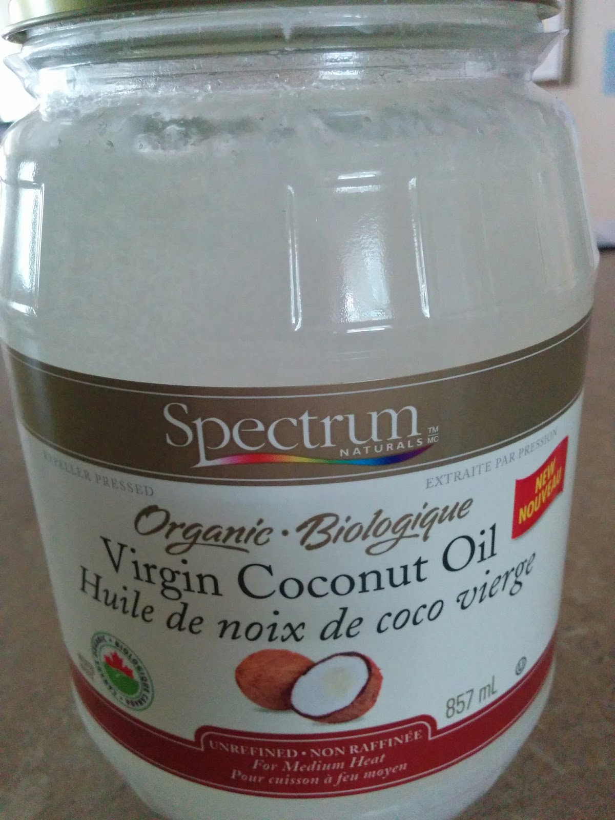 L’huile de coco, de plus en plus populaire, se vend dans la section biologique en épicerie. Elle devient liquide et transparente l’été et durcie et devient blanche l’hiver. Pas besoin de la mettre au frigo, on l’a garde température pièce.