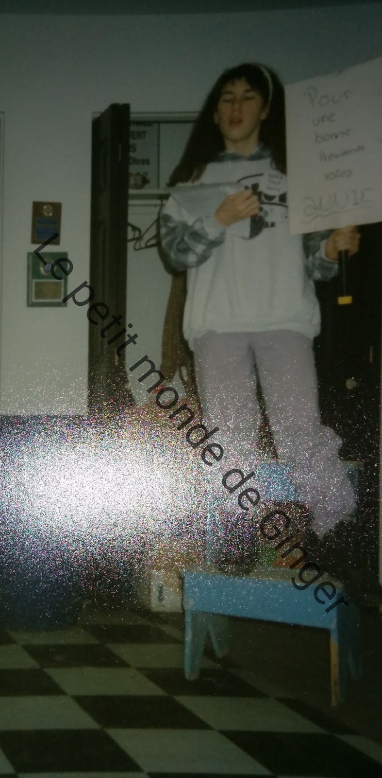 Vieille photo d’archive de moi en 6ème année prononçant un discours pour devenir présidente du club octogone junior. J’ai fini secrétaire. Mention spéciale au coton ouaté de Charlottes Hornets. Je n’ai jamais suivi le baskeball de ma vie, j’aimais juste l’abeille.