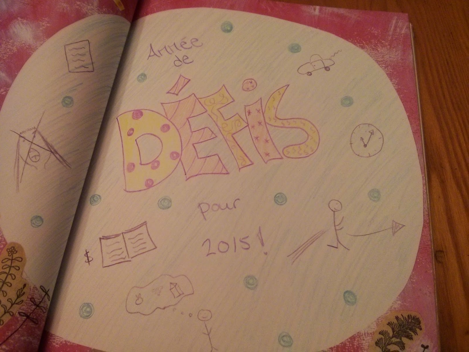 En 2013, j’optais pour une année d’organisation et en 2014, pour une année de changement. Pour 2015, il n’y a qu’un mot qui me vient en tête et ce sera une année de défi !! Si vous regardez le dessin ci-joint, peut-être que vous pensez comme ma fille et que vous vous dîtes que je devrais pratiquer le dessin à la place, mais bon, l’important, c’est que je me comprenne. Je me suis donnée tous pleins de petits défis personnelles à réaliser durant l’année. Mais il y en a un auquel je tiens particulièrement: soit celui d’aller chercher mon permis de consuire. Je suis tannée, j’ai 33 ans, je suis plus quie prête !! Sans compter qu’on a 2 voitures, et que chaque matin, je quitte la maison en regardant celle des 2 qui reste là quand je pourrais l’utilisder ai lieu de marcher…Mon plan de match ? Je recommence à pratiquer avec mon mari au printemps, et dès que la session se termine, je vais passer mon examen ! C’est un gros défi, mais j’y tiens 🙂