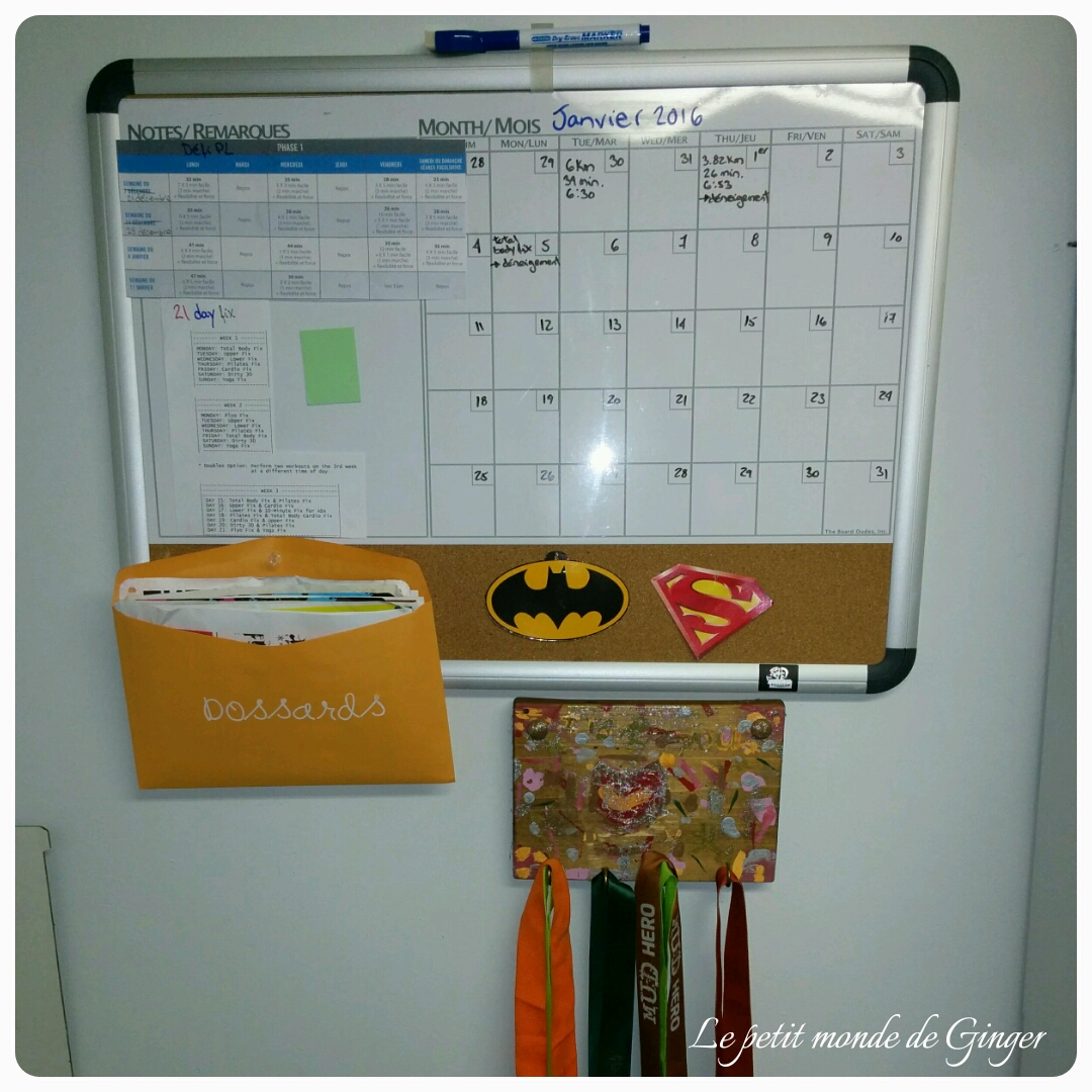 Depuis que l’on a acheté la maison que ce babillard traîne au sous-sol, alors aussi bien en tirer profit. J’y ai donc mis mes plans d’entrainement, un calendrier pour noter ce que je fais (avec le stationnement que j’ai, le déneigement compte, croyez moi), une enveloppe contenant mes dossards de course, un petit rappel que je suis une super-héroïne et j’ai accroché mes médailles sur un vieux cadeau de fête des pères que M. a fait en 2010. D’autres choses s’y ajouteront avec le temps, mais la base y est et reste que je suis contente du résultat. Comme il se trouve là où sont ranger mes poids et mon tapis d’entrainement, je le vois tous les jours. Mes 2 défis de taille cette année seront le Défi Pierre Lavoie qui aura lieu au printemps et un demi-marathon à l’automne. Le premier me fait surtout peur à cause de la vie de groupe. Devoir être plus de 30 heures avec le même monde, je ne sais pas, ça me fait peur. Plus que le manque de sommeil qui est pourtant une des plus grandes parties du défi. Le deuxième me fait aussi peur, car c’est en m’entrainement pour un demi que je me suis blessé l’été dernier. Mais je me dis que j’ai appris, j’ai compris que je ne dois pas augmenter mon volume de course trop rapidement et je suis allé chercher l’aide nécessaire, alors ça devrait aller.