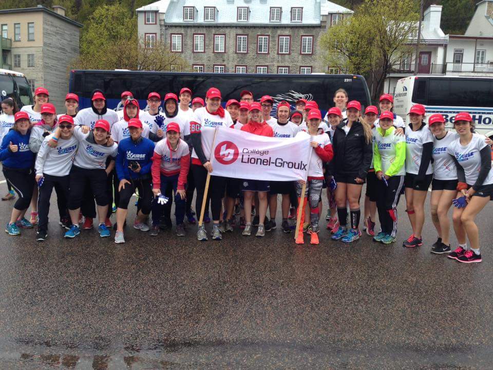 Mon orgueil ayant été un peu amoché, je me suis repris en faisant 2 km 2 fois de suite et ça super bien été. On est ensuite passé par Sainte-Anne-de-la-Pérade, mais on a passé tout droit, n’ayant pas vraiment besoin de faire d’arrêt. La dernière ville à nous accueillir avant d’arriver à Québec était Donnacona là où nous attendaient de vraies toilettes et de vrais lavabos. Ça l’air bizarre dit comme ça, mais je n’en pouvais plus de me laver les mains au purel ou avec des wet ones…On a continué les relais en équipe de 4 jusqu’à temps qu’on arrive dans la grande ville pour repprendre les relais à 2. J’ai eu la chance de courir 1.2 km à Ste-Foy, c’était super de courir en pleine ville, avec tous les automobilistes et passants qui nous saluaient !! Une fois arrivée au Vieux-Port, il nous restait 2.8 km à courir en gang. Comme tout au long de la course, on devait respecter la vitesse du plus lent. Avec 2 blessés, on faisait seulement un petit jogging légé, mais peu importe, l’important était de terminer tout le monde ensemble, de la même manière que l’aventure avait commencée. On chantait notre cri de ralliement, des chansons de camps de jours, on faisait aller nos clapettes, on avait bien du fun !! Notre bonne humeur étaient contagieuses, tout le monde nous saluaient et nous encourageait !! C’était génial de voir autant de gens armés de gants, manteaux et parapluies pour se protéger…Ils n’avaient pas à être là, ils ne couraient pas, mais ils étaient tout de mêmes présents. C’est les yeux plein d’eau que j’ai reçu ma médaille. Je suis fière d’avoir parcourue 32 km en 2 jours, j’aurais pu en faire plus, on aurait tous pu en faire plus, mais le but était que tout le monde participe. Nous étions tous sur notre petit nuage, nous avons pris quelques photos et sommes retourné dans le bus pour festoyer avec notre boîte à lunch. Il y avait un repas chaud (brochettes et légumes sautés), un repas froid (salade de macaroni et de légumineuses), breuvage (juste de légume ou lait au chocolat) et dessert (brownies et salade de fruits), il y en avait donc pour tous les goûts !! Enfin un vrai repas après des petites collations de type fromage, lait de soya, crudités, bretzels, canne de thon et j’en passe !! Arrivée au cégep, nous avons vidé l’autobus en un temps record avant de rentrer chez nous. Heureusement pour moi, mon premier examen était prévu à 12h30, alors j’ai pu me reposer un peu.